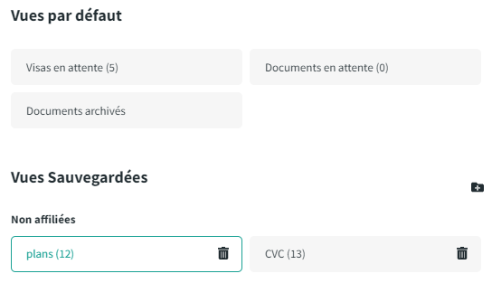 Au sein de l'interface de gestion des vues, vous retrouverez les cartes de vues. Le clic sur une carte vous permet de charger la vue, la liste des documents se mettra à jour et une étiquette contenant le nom de la vue chargée apparaîtra dans la barre de navigation.