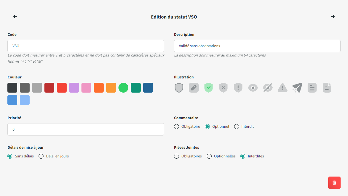 | Code | Description | Couleur | Illustration | Commentaire | Pièces jointes | Délai de mise à jour | Priorité |