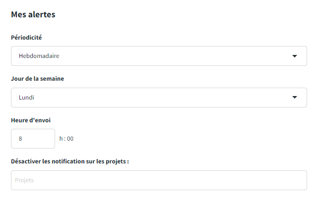 | Désactiver les notifications sur les projets | Permet de sélectionner les projets que vous ne souhaitez plus voir intégrés au récapitulatif | Tous les projets dont vous êtes membre |